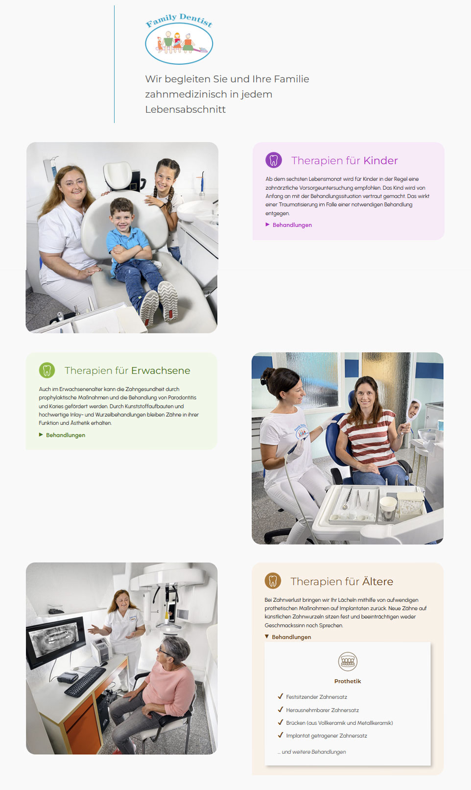 Um den Gedanken der Betreuung ganzer Familien zu unterstreichen, habe ich die Therapien nach Altersgruppen von Patienten gegliedert. Passende Fotos werden durch farbige Kästen ergänzt, die die Farben des Logos aufgreifen.